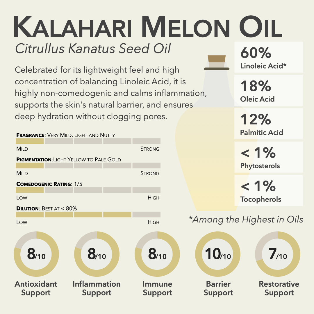 Organic Simmondsia Chinensis (Jojoba) Seed Oil, Organic Argania Spinosa Kernel (Argan) Oil, Organic Camellia Oleifera Seed Oil, Organic Citrullus Lanatus (Kalahari Melon) Seed Oil, Organic Helianthus Annuus (Sunflower) Seed Oil, Organic Rosmarinus Officinalis (Rosemary) Leaf Extract.